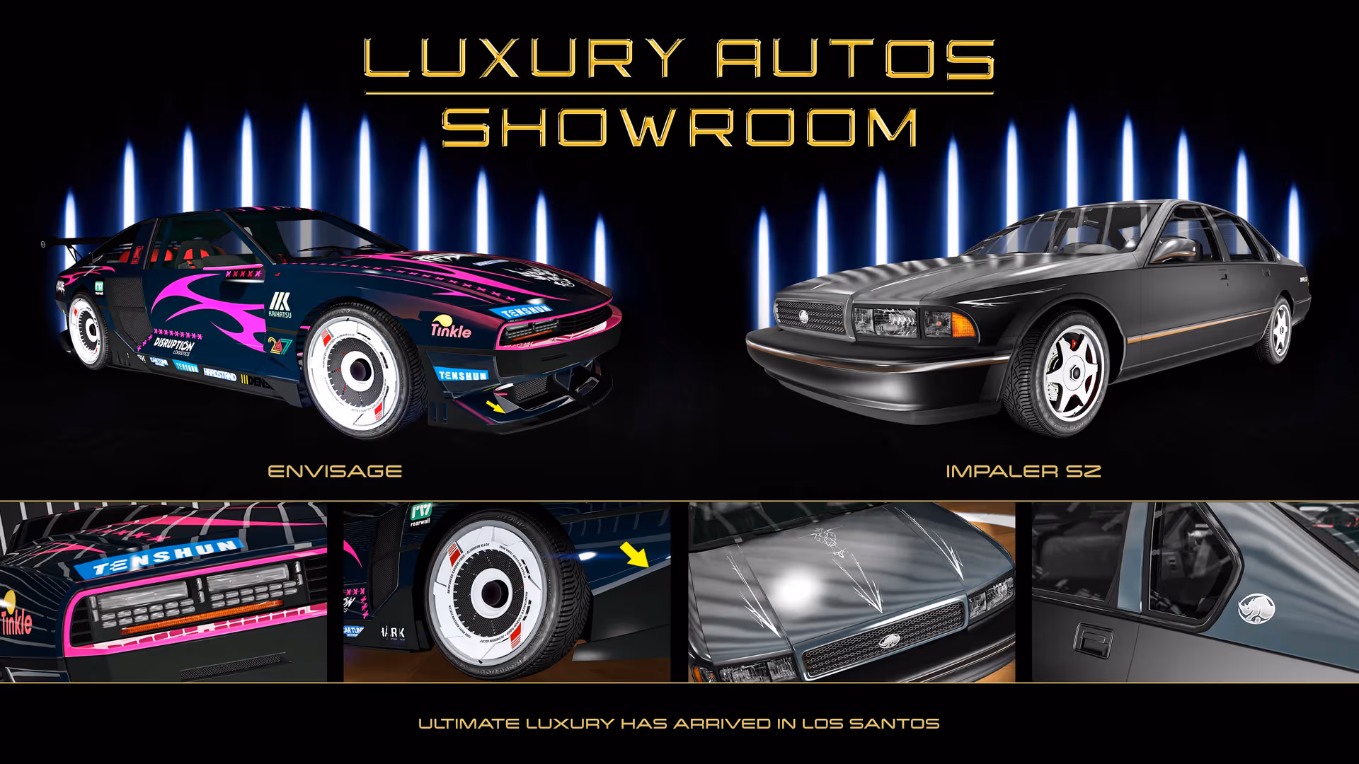 Premium Deluxe Motorsport: Dinka Thrust, Enus Stafford wrapped in the "Oh Enus!" Limited-Time Livery, Invetero Coquette BlackFin, Progen Tyrus & Weeny Dynasty