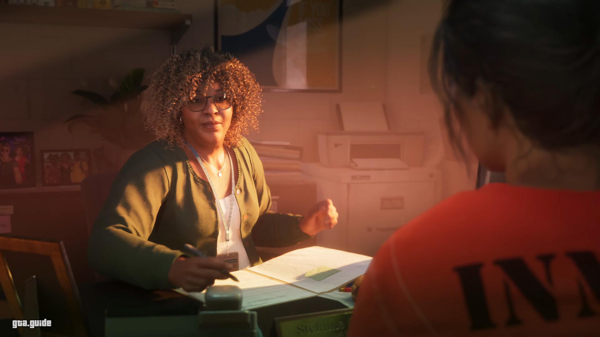 Stefanie is one of the characters in the upcoming game Grand Theft Auto VI. She is supposed to be a social worker at the Leonida Department of Corrections. In the first trailer Stefanie in her office has a conversation with the then-incarcerated protagonist Lucia.